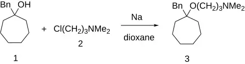 Grignard addition of benzylmagnesiumbromide to suberone would give 1-benzylcycloheptanol [4006-73-9] (1'). Williamson ether synthesis with 3-dimethylaminopropylchloride [109-54-6] (2) completed the synthesis of bencyclane (3).