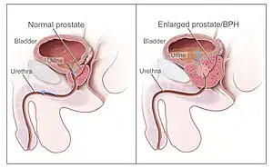 Benign prostatic hyperplasia (BPH), also called prostate enlargement, is a noncancerous increase in size of the prostate gland.[1] Symptoms may include frequent urination, trouble starting to urinate, weak stream, inability to urinate, or loss of bladder control.[1] Complications can include urinary tract infections, bladder stones, and chronic kidney problems.[2]