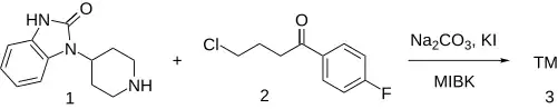 4-(2-Keto-1-benzimidazolinyl)piperidine (1) is alkylated with 4-chloro-4'-Fluorobutyrophenone (2) to produce benperidol (3).[16][17]