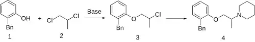 The base-catalyzed ether formation between 2-benzylphenol (1) and 1,2-dichloropropane (2) gives 1-benzyl-2-(2-chloropropoxy)benzene (3).[3][4][5][6] Displacement of the remaining halogen with piperidine completes the synthesis of benproperine (4).