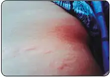 Side effects tend to be common and occur more frequently with increased age.[16] The most common adverse reactions associated with benznidazole are allergic dermatitis and peripheral neuropathy.[1] It is reported that up to 30% of people will experience dermatitis when starting treatment.[17][18] Benznidazole may cause photosensitization of the skin, resulting in rashes.[1] Rashes usually appear within the first 2 weeks of treatment and resolve over time.[18] In rare instances, skin hypersensitivity can result in exfoliative skin eruptions, edema, and fever.[18] Peripheral neuropathy may occur later on in the treatment course and is dose dependent.[1] It is not permanent, but takes time to resolve.[18]