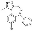 | Alprazolam | Xanax, Helex, Xanor, Trankimazin, Onax, Alprox, Misar, Restyl, Solanax, Tafil, Neurol, Frontin, Kalma, Ksalol, Farmapram | 1981 | 0.25, 0.5, 1, 2 | 0.5 | 1–3[16] | 11-13 [10–20][16] | anxiolytic, antidepressant[17] |