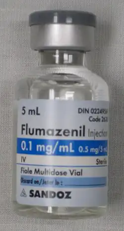 - 1 2 Weinbroum AA, Flaishon R, Sorkine P, Szold O, Rudick V (September 1997). "A risk-benefit assessment of flumazenil in the management of benzodiazepine overdose". Drug Safety. 17 (3): 181–96. doi:10.2165/00002018-199717030-00004. PMID 9306053. S2CID 1055503.