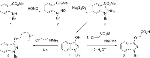 Synthesis starts with the reaction of the N-benzyl derivative from methyl anthranilate with nitrous acid to give the N-nitroso derivative. Reduction by means of sodium thiosulfate leads to the transient hydrazine (3), which undergoes spontaneous internal hydrazide formation. Treatment of the enolate of this amide with 3-chloro-1-dimethylamino propane gives benzydamine (5). Please note there is an error in this section: US3318905 states that the nitroso derivative is reduced with sodium hydrosulfite (sodium dithionite) and not with sodium hyposulfite (sodium thiosulfate), as shown in the above scheme and stated in text.