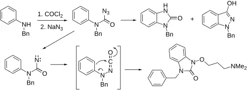 - ↑ Baiocchi L, Corsi G, Palazzo G (1965). "Ricerche nel campo degli indazoli.—Nota 1. Sulla ciclizzazione termica di azidi di acidi N-aril-N-benzil-carbamici". Annali di Chimica. 55: 116–25.