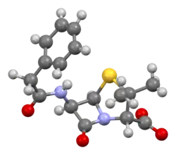 - ↑ "Conformations of penicillin G: crystal structure of procaine penicillin G monohydrate and a refinement of the structure of potassium penicillin G". J. Chem. Soc. Perkin Trans. 1: 185–190. 1978. doi:10.1039/p19780000185.