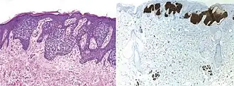 Comparison H&E stain (left) with BerEP4 immunohistochemistry staining (right) on a pathological section having BCC with squamous cell metaplasia. Only BCC cells are stained with BerEP4.[1]
