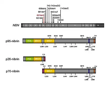 - ↑ Warcoin M, Lespinasse J, Despouy G, Dubois d'Enghien C, Laugé A, Portnoï MF, Christin-Maitre S, Stoppa-Lyonnet D, Stern MH (2009). "Fertility defects revealing germline biallelic nonsense NBN mutations". Hum. Mutat. 30 (3): 424–30. doi:10.1002/humu.20904. PMID 19105185. S2CID 23883591.