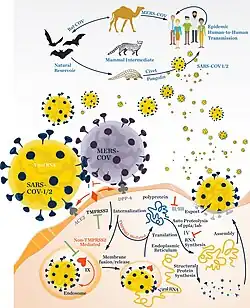 - ↑ Woo, P. C.; Wang, M.; Lau, S. K.; Xu, H.; Poon, R. W.; Guo, R.; Wong, B. H.; Gao, K.; Tsoi, H. W.; Huang, Y.; Li, K. S.; Lam, C. S.; Chan, K. H.; Zheng, B. J.; Yuen, K. Y. (2007). "Comparative analysis of twelve genomes of three novel group 2c and group 2d coronaviruses reveals unique group and subgroup features". Journal of Virology. 81 (4): 1574–85. doi:10.1128/JVI.02182-06. PMC 1797546. PMID 17121802.