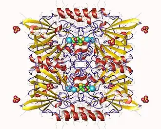 The other type of beta-lactamase is of the metallo type ("type B"). Metallo-beta-lactamases (MBLs) need metal ion(s) (1 or 2 Zn2+ ions[2]) on their active site for their catalytic activities.[3] The structure of the New Delhi metallo-beta-lactamase 1 is given by 6C89. It resembles a RNase Z, from which it is thought to have evolved.