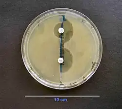 Escherichia coli bacteria on the right are sensitive to two beta-lactam antibiotics, and do not grow in the semi-circular regions surrounding antibiotics. E. coli bacteria on the left are resistant to beta-lactam antibiotics, and grow next to one antibiotic (bottom) and are less inhibited by another antibiotic (top).