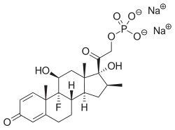 Betamethasone sodium phosphate is a synthetic glucocorticoid corticosteroid and a corticosteroid ester.[1] It is the disodium salt of the phosphate ester of betamethasone.