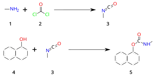 The UCIL factory was built in 1969 to produce the pesticide Sevin (UCC's brand name for carbaryl) using methyl isocyanate (MIC) as an intermediate.[6] An MIC production plant was added to the UCIL site in 1979.[11][12][13] The chemical process employed in the Bhopal plant had methylamine reacting with phosgene to form MIC, which was in turn reacted with 1-naphthol to form the final product, carbaryl. Another manufacturer, Bayer, also used this MIC-intermediate process at the chemical plant once owned by UCC at Institute, West Virginia in the United States.[14][15]