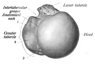 Anterior view of the head of left humerus. Bicipital groove seen in the middle.