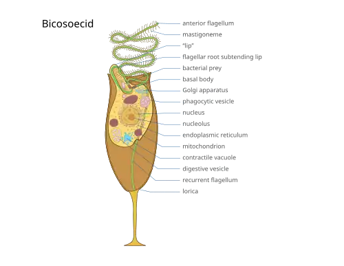 Bicosoecida (ICZN) or Bicosoecales/Bicoecea (ICBN) is an order of Bikosea, a small group of unicellular flagellates, included among the stramenopiles. Informally known as bicosoecids, they are free-living cells, with no chloroplasts, and in some genera are encased in a lorica.