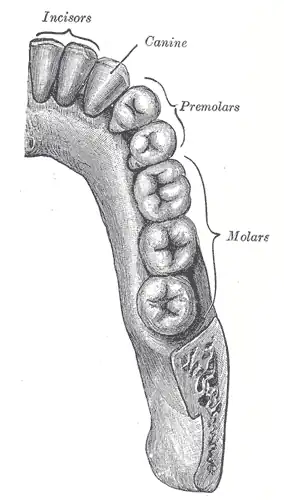 ![]() Permanent teeth of right half of lower dental arch, seen from above | |