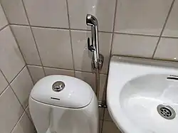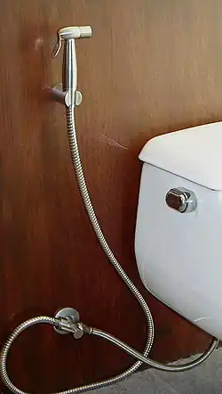 A bidet shower—also known as a handheld bidet, commode shower, toilet shower, health faucet, bum shower, jet spray, hand shower, shatafa (from the Arabic: شَطَّافَة [ʃɑtˤˈtˤɑːfɑ], "hand shower rinser"), Muslim shower (common in Pakistan) or bum gun—is a hand-held triggered nozzle that is placed near the toilet and delivers a spray of water used for anal cleansing and cleaning of the genitals after using the toilet for defecation and urination. The device is similar to that of a kitchen sink sprayer.[1]