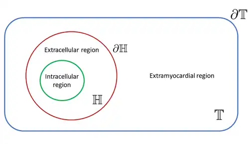 The bidomain domain is principally represented by two main regions: the cardiac cells, called intracellular domain, and the space surrounding them, called extracellular domain. Moreover, usually another region is considered, called extramyocardial region. The intracellular and extracellular domains, which are separate by the cellular membrane, are considered to be a unique physical space representing the heart (), while the extramyocardial domain is a unique physical space adjacent of them (). The extramyocardial region can be considered as a fluid bath, especially when one wants to simulate experimental conditions, or as a human torso to simulate physiological conditions.[12] The boundary of the two principal physical domains defined are important to solve the bidomain model. Here the heart boundary is denoted as while the torso domain boundary is [12]