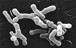 Bifidobacterium longum is a Gram-positive, catalase-negative, rod-shaped bacterium present in the human gastrointestinal tract and one of the 32 species that belong to the genus Bifidobacterium.[2][3] It is a microaerotolerant anaerobe and considered to be one of the earliest colonizers of the gastrointestinal tract of infants.[2] When grown on general anaerobic medium, B. longum forms white, glossy colonies with a convex shape.[4] B. longum is one of the most common bifidobacteria present in the gastrointestinal tracts of both children and adults.[5] B. longum is non-pathogenic, is often added to food products,[2][6] and its production of lactic acid is believed to prevent growth of pathogenic organisms.[7]