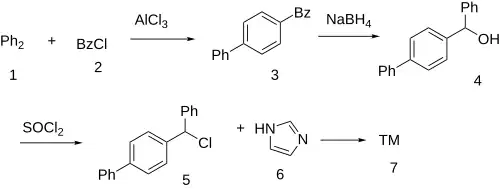 Friedel-Crafts acylation between biphenyl (1) and benzoyl chloride (2) gives 4-phenylbenzophenone (3). Reduction with sodium borohydride gives the alcohol (4). Halogenation by thionyl chloride gives (5). Amination with imidazole (6) completes the synthesis of bifonazole.[8][9][10]