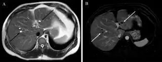 - ↑ 4.0 4.1 Horton, KM; Bluemke, DA; Hruban, RH; Soyer, P; Fishman, EK (Mar–Apr 1999). "CT and MR imaging of benign hepatic and biliary tumors". Radiographics. 19 (2): 431–51. doi:10.1148/radiographics.19.2.g99mr04431. PMID 10194789.