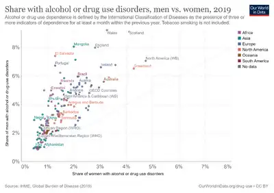 There is no known safe level of alcohol consumption either when trying to get pregnant or during pregnancy.[93] With alcohol abuse remaining highly stigmatized—particularly in the case of pregnant women—some advocate for treatment programs to focus on a non-judgmental stance, on personal empowerment, and on offering contraceptives to women engaging in sex, in order to prevent fetal alcohol spectrum disorder.[94] However, men are almost twice as likely to partake in excessive drinking than women,[95] there being a higher rate of alcohol-related hospitalizations among males than females.[96] Researchers from Columbia and Yale found the discrepancy could be due to the fact men release more dopamine during alcohol consumption than women. The increased neurochemical release causing a stronger association with pleasure and alcohol intoxication. "This may contribute to the initial reinforcing properties of alcohol and the risk for habit formation".[97]