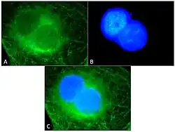 The binucleated cell above is an oral squamous cell carcinoma, cell line UPCI-SCC-103. A: The cancer cell treated with antibodies against tubulin. B: The same cancer cell stained with DAPI, highlighting the nuclei. C: Both photos superimposed.