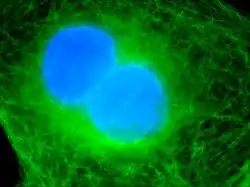 A binucleated cell has two nuclei. The cell above was stained with DAPI to highlight the nuclei and treated with antibodies against tubulin to highlight the microtubules to show the binucleation.