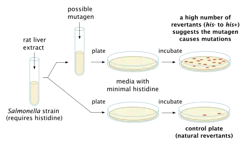 One classical bioassay is the Ames test. A strain of Salmonella that requires histidine to grow is put on two plates with growth medium containing minimal amounts of histidine and some rat liver extract (to mimick liver metabolism). A suspected mutagen is added to one plate. If the plate with the suspected mutagen grows more visible colonies, it is probably mutagenic: a mutagen might cause the strain of bacterium to regain the ability to make its own histidine.[13]