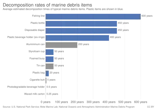 - ↑ "Marine Debris Biodegradation Time Line" Archived 2011-11-05 at the Wayback Machine. C-MORE, citing Mote Marine Laboratory, 1993.