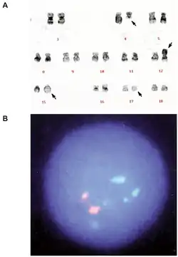 - ↑ Saito, M; Izumiyama, K.; Mori, A.; et al. (2013). "Biphenotypic acute leukemia with t(15;17) lacking promyelocytic-retinoid acid receptor α rearrangement". Hematol. Rep. 5 (4): e16. doi:10.4081/hr.2013.e16. PMC 3883063. PMID 24416501.