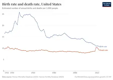 - ↑ "U.S. birth rate hits all-time low, CDC data shows - CBS News". www.cbsnews.com. 24 July 2025. Archived from the original on 28 October 2025. Retrieved 26 October 2025.