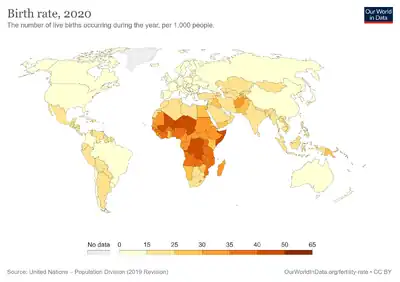 The average global birth rate was 18.1 births per 1,000 total population in 2021.[8] The death rate was 7.7 per 1,000. The RNI was thus 1.6 percent. In 2012 the average global birth rate was 19.611 according to the World Bank[9] and 19.15 births per 1,000 total population according to the CIA,[10] compared to 20.09 per 1,000 total population in 2007.[11]
