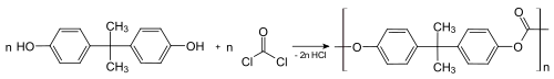 About 65–70% of all bisphenol A is used to make polycarbonate plastics,[9][10] which can consist of nearly 90% BPA by mass. Polymerisation is achieved by a reaction with phosgene, conducted under biphasic conditions; the hydrochloric acid is scavenged with aqueous base.[43] This process converts the individual molecules of BPA into large polymer chains, effectively trapping them.