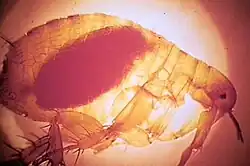 Oriental rat flea (Xenopsylla cheopis) infected with the Yersinia pestis bacterium which appears as a dark mass in the gut. The foregut (proventriculus) of this flea is blocked by a Y. pestis biofilm; when the flea feeds on an uninfected host Y. pestis is regurgitated into the wound, causing infection.