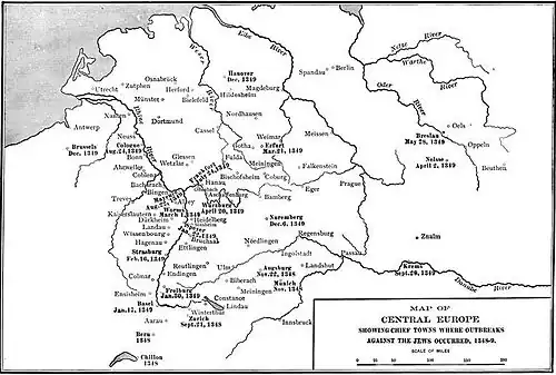 According to the chronicler Heinrich von Diessenhoven, all Jews from Cologne to Austria were killed in a series of massacres between November 1348 and September 1349.[1]