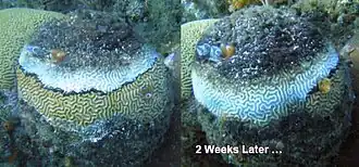 - ↑ Richardson, L.L; R.G. Carlson (1993). "Behavioral and chemical aspects of Black Band disease of corals: An in situ field and laboratory study". In: Heine and Crane (Eds). Diving for Science...1993. Proceedings of the 13th Annual Scientific Diving Symposium. American Academy of Underwater Sciences: 107–116. Archived from the original on September 20, 2013. Retrieved 2013-09-20.