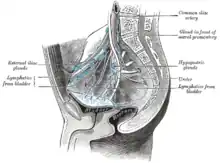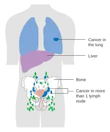 The most common sites for bladder cancer metastases are the lymph nodes, bones, lung, liver, and peritoneum.[76] The most common sentinel lymph nodes draining bladder cancer are obturator and internal iliac lymph nodes. The location of lymphatic spread depends on the location of the tumors. Tumors on the superolateral bladder wall spread to external iliac lymph nodes. Tumors on the neck, anterior wall and fundus spread commonly to the internal iliac lymph nodes.[77] From the regional lymph nodes (i.e. obturator, internal and external lymph nodes) the cancer spreads to distant sites like the common iliac lymph nodes and paraaortic lymph nodes.[78] Skipped lymph node lesions are not seen in bladder cancer.[77]