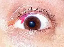 - Subconjunctival hemorrhage – bloody eye arising from a broken blood vessel in the sclera (whites of the eyes). Often the result of strain, including sneezing, coughing, vomiting or other kind of strain