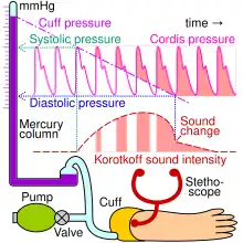 - ↑ Audio recordings of Korotkoff sounds Archived 2019-10-22 at the Wayback Machine. Slide seven of twenty-two, Cardiff University/Prfysgol Caerdydd. Accessed 27 September 2016