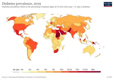 - ↑ Danaei, G (2 July 2011). "National, regional, and global trends in fasting plasma glucose and diabetes prevalence since 1980: systematic analysis of health examination surveys and epidemiological studies with 370 country-years and 2·7 million participants". The Lancet. 378 (9785): 31–40. doi:10.1016/S0140-6736(11)60679-X. PMID 21705069. S2CID 13951614.