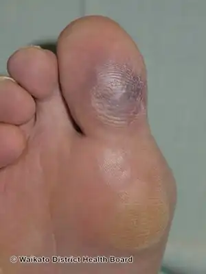 Blue toe syndrome is a situation that may reflect atherothrombotic microembolism, causing transient focal ischaemia, occasionally with minor apparent tissue loss, but without diffuse forefoot ischemia.[1] The development of blue or violaceous toes can also occur with trauma, cold-induced injury, disorders producing generalized cyanosis, decreased arterial flow, impaired venous outflow, and abnormal circulating blood.[2][3][4][5] The terms "blue toe syndrome", "grey toe syndrome" and "purple toe syndrome" are sometimes used interchangeably.[6]