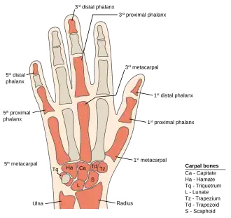 The bones considered in the TW3 method include the distal radius and ulna, the metacarpals and phalanges of the 1st, 3rd, and 5th fingers, and all of the carpal bones except the pisiform.[8][16]