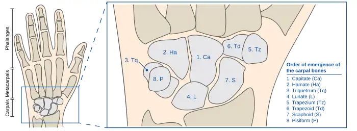 The carpal bones arise from primary ossification centers and continue their calcification in an outward manner. The emergence of the primary ossification centers of the carpal bones appear in a predictable order that can help in determining bone age. First the capitate forms at an average age of 2 months, followed shortly by the hamate, then the triquetrum around 14 months, and so on.[46]