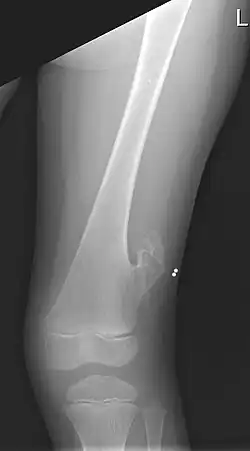 An exostosis, also known as a osteochondroma, is a benign chondrogenic lesion derived from aberrant cartilage from the perichondral ring.[1] Exostoses can cause chronic pain ranging from mild to moderate, but rarely severe, depending on the shape, size, and location of the lesion, though most are asymptomatic and are found serendipitously on plain x-ray taken for other reasons. It is most commonly found in pre-teens through early 20s adjacent to the physes of the distal femur and proximal tibia but can be found adjacent to other physes, most notably the distal phalanx of the finger, where it presents as a subungual mass. larger growths can occur on places like the ankles, knees, shoulders, elbows and hips. Very rarely are they on the skull. Though rare, malignant transformation can occur into a chondrosarcoma.