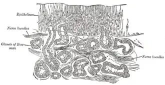 Olfactory glands, also known as Bowman's glands, are a type of nasal gland situated in the part of the olfactory mucosa beneath the olfactory epithelium, that is the lamina propria, a connective tissue also containing fibroblasts, blood vessels and bundles of fine axons from the olfactory neurons.[1]
