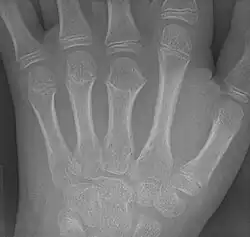 Brachymetacarpia or brachymetacarpalia is a medical condition in which the metacarpal bones of the hands are shortened.[1] The equivalent condition in the foot is brachymetatarsia, in which the metatarsal bones are shortened. Brachymetacarpia is typically congenital and presents in childhood or early adolescence, but it can also be associated with other acquired syndromes or endocrinological conditions. While cosmetic appearance is the most common concern of affected individuals, brachymetacarpia may also affect hand function due to alterations in muscle and tendon length. Treatment usually involves lengthening of the affected bone(s), either acutely with a bone graft or gradually with an external fixator.[2]
