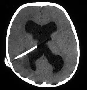 | Brain abscess in a person with a CSF shunt.[1] | |