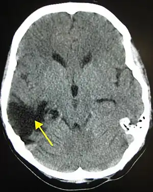 - stroke leading to infarct, which may follow thrombosis, embolisms, angiomas, aneurysms, and cerebral arteriosclerosis.[24]