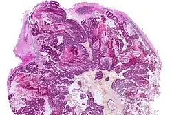 Micrograph showing a colorectal carcinoma metastasis to the cerebellum. HPS stain.